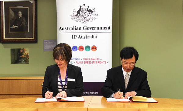澳大利亚知识产权局代理副局长(左)与杨铁军(右)签署会谈会议纪要