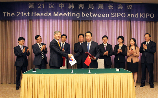 11月16日,第21次中韩知识产权局局长会议在广东省广州市举行,中国国家知识产权局局长申长雨与韩国特许厅厅长崔东圭出席会议。