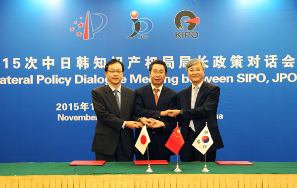 11月17日,第15次中日韩知识产权局局长政策对话会在广州召开。中国国家知识产权局局长申长雨、日本特许厅长官伊藤仁、韩国特许厅厅长崔东圭出席会议并讲话,三方共同回顾了过去一年的合作成果,并就共同关心的话题进行了深入交流。