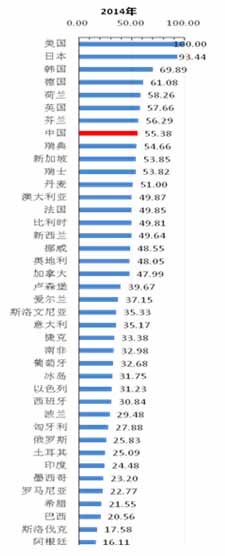 在国际比较方面,报告显示,2008年至2014年,我国排名逐年上升,在40个样本国家中,排名从第19位快速跃升至第8位。2014年,我国知识产权综合发展国际指数为55.38,较上一年增长1.19;但与美国、日本存在较大差距。其中,我国知识产权能力指数为64.94,稳居第3,与第二名日本的差距进一步缩小;绩效指数得分达到50.20分,较上一年提升3.96分,排名第3位;环境指数得分42.32分,较上一年度提升0.49分,在样本国家中排名依旧处在第30位,排名位次极不均衡。知识产权环境建设是一个长期而艰巨的工程,从报告中看,2014年,我国市场环境指数和文化环境指数得分分别比上一个年度提高0.57分和1.73分,同比增长仅1.76%和6.54%,增速仅能保持与样本国家得分的平均增速持平,市场环境和文化环境的改善不甚明显。报告显示,目前我国知识产权市场环境和文化环境较之知识产权制度环境来说,贡献明显不足,环境建设结构有待调整,知识产权市场环境和文化环境亟待优化。