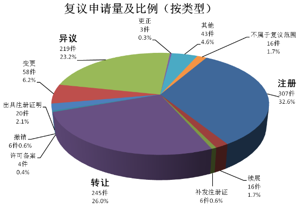 第三,商标行政复议程序作为解决商标注册程序性争议的主渠道作用进一步凸显。当事人不服商标局具体行政行为,不经复议直接向法院起诉的案件85件,为复议案件数量的9%;经过复议又向法院起诉的案件36件,占全部复议案件的3.8%。这充分表明,复议作为可选择程序,受到当事人的高度信赖和认同,真正发挥了解决商标注册程序性争议的主渠道作用。